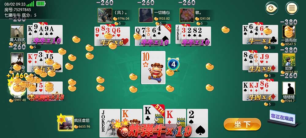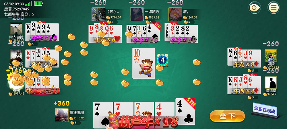 七癞牛牛游戏中的下注环节是增加游戏刺激感的重要部分。玩家可以根据自己牌型的评估以及对手的表现进行下注。如果玩家拿到一手牌型比较好,比如大概率能组成牛九以上的牌型,就可以适当高额下注。相反,如果牌型较差,可能选择低额下注或者放弃(在一些变体规则中存在弃牌机制)。